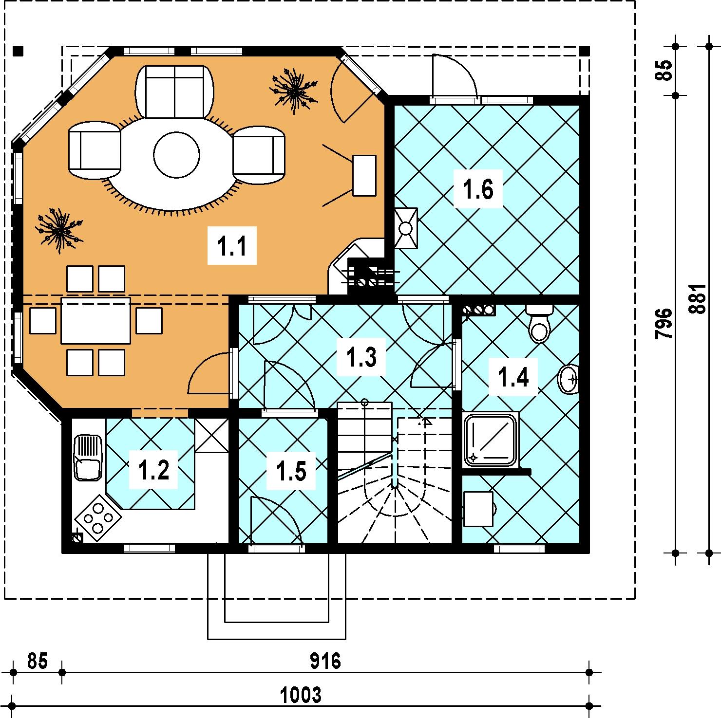 1 pokój dzienny 30.30 kuchnia 5.80 hall 9.10 łazienka 8.00 wiatrołap 3.30 kotłownia 10.40