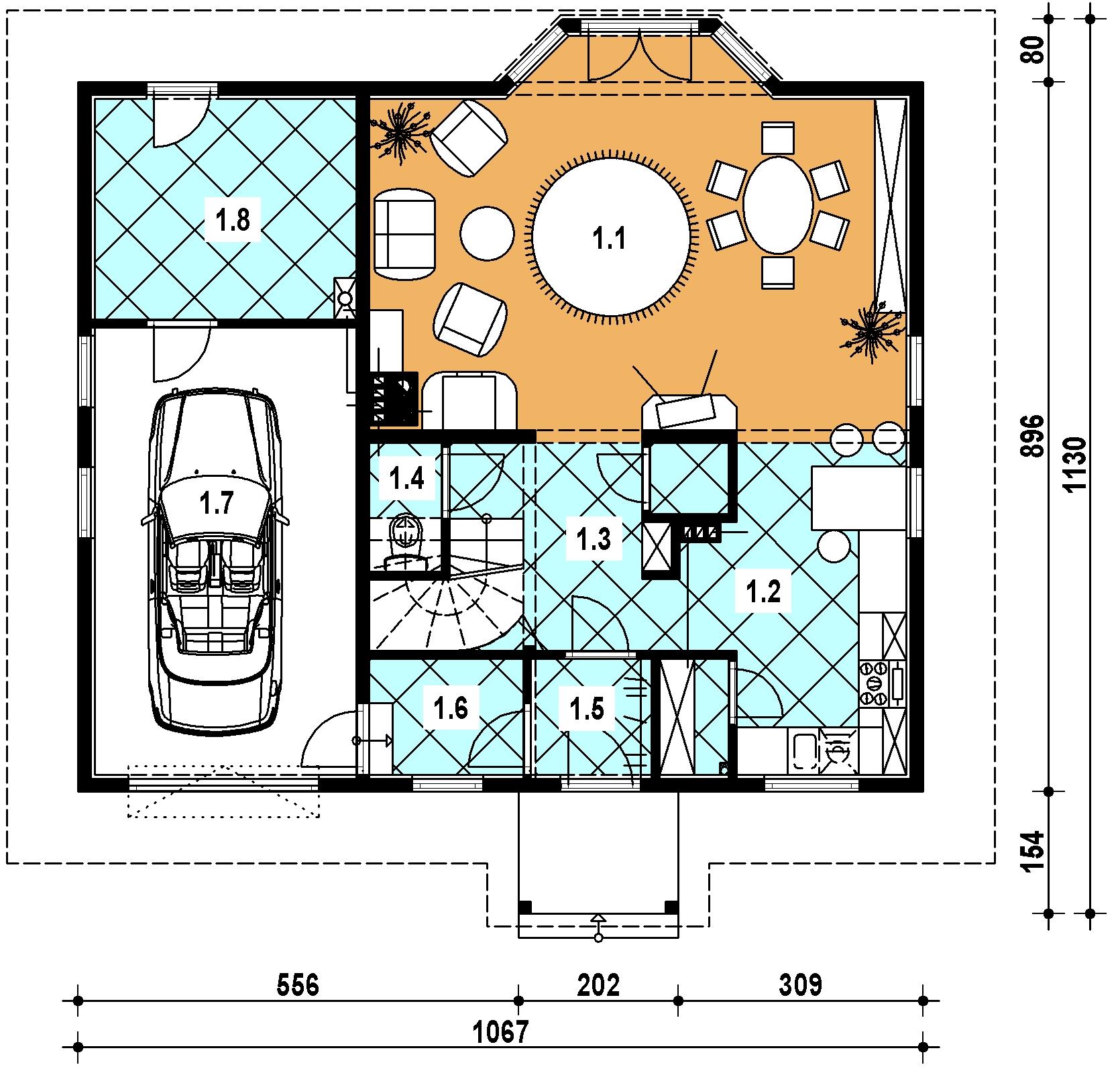 1 pokój dzienny 30.00 kuchnia 11.20 hall 7.00 wc 1.50 wiatrołap 2.20 pom. gospodarcze 3.80 garaż 0.00 kotłownia 9.20