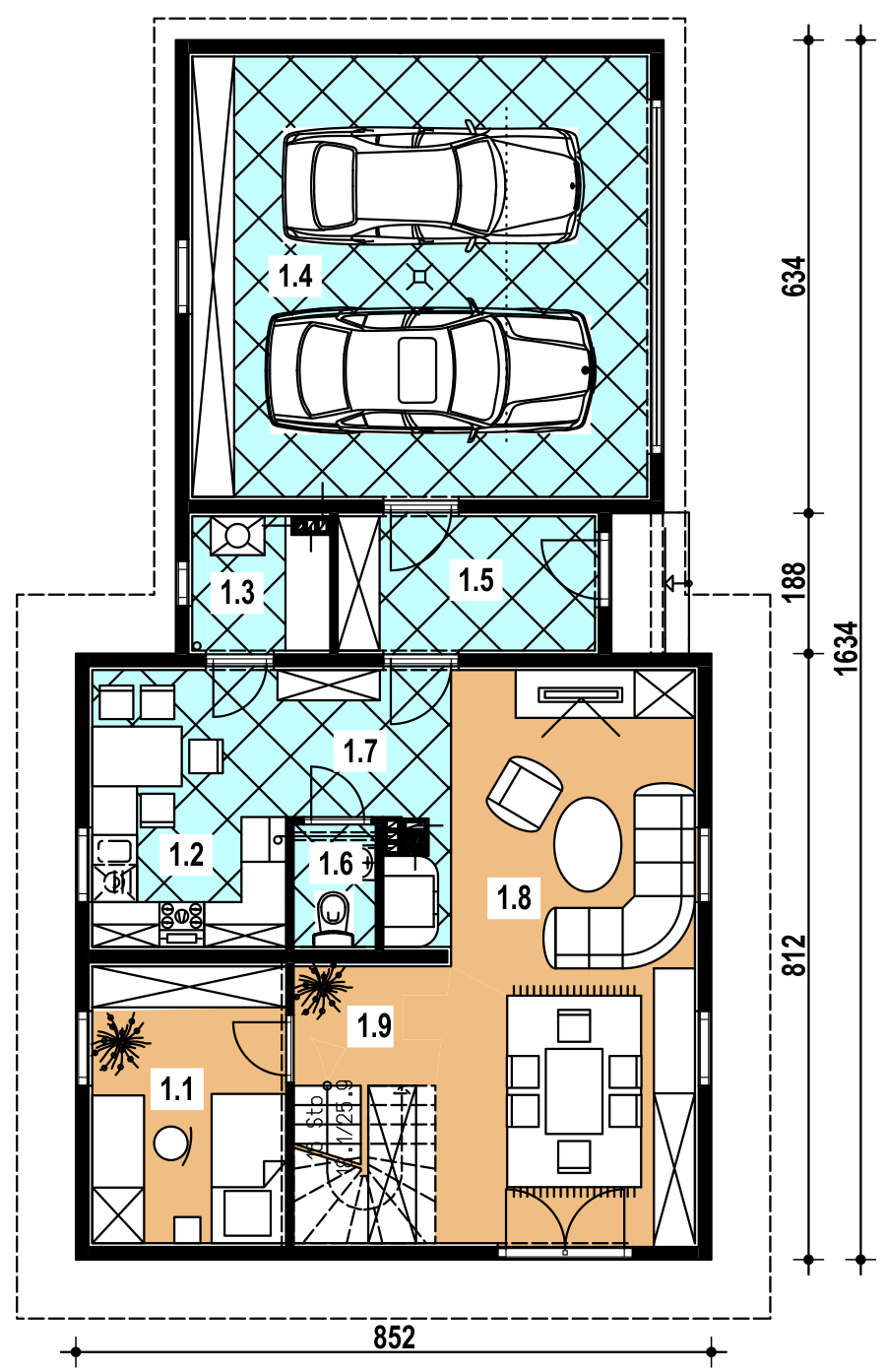 1 komunikacja 5.00 pokój dzienny 27.20 hall 4.40 toaleta 1.80 wiatrołap 6.20 garaż 0.00 spiżarka 3.20 kuchnia 9.60 sypialnia 9.60
