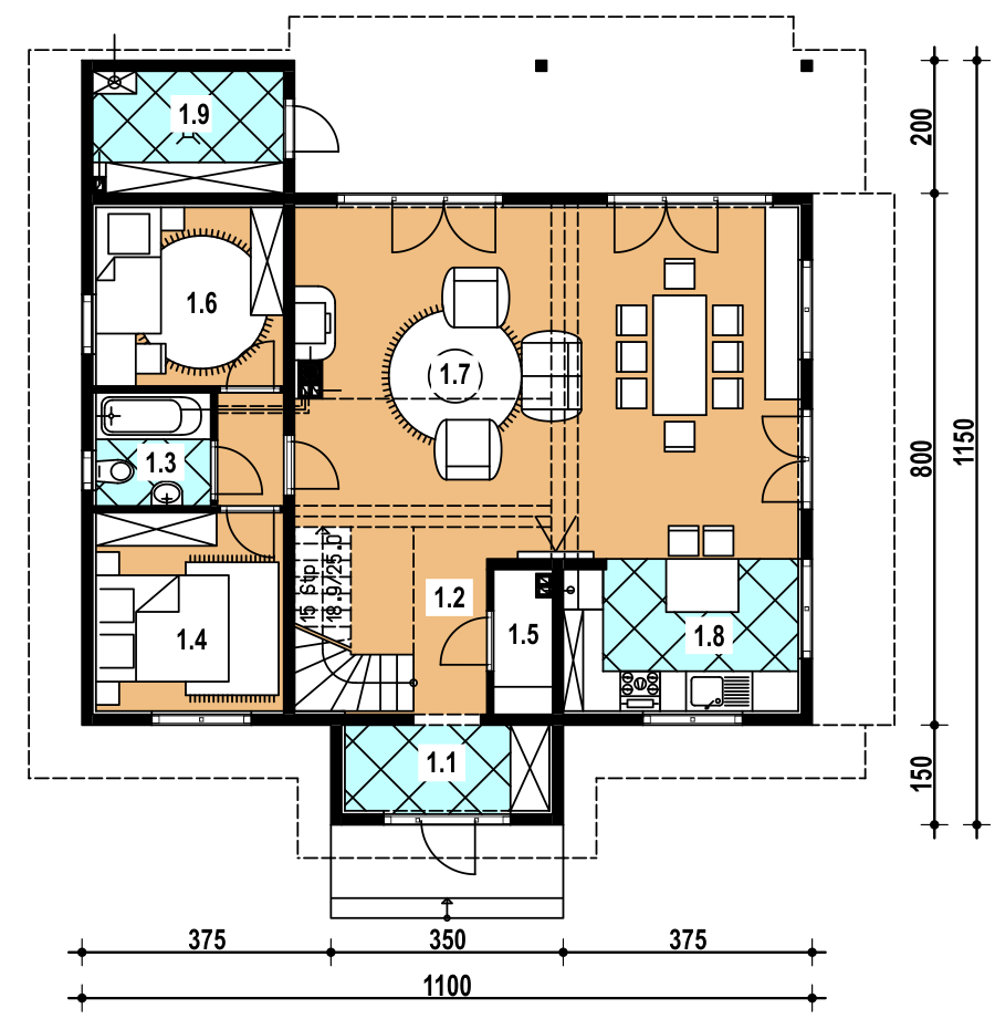 1 przedsionek 3.60 hall 4.90 łazienka 2.80 sypialnia 8.10 pomieszczenie gospodarcze 1.80 pokój 7.20 pokój dzienny 38.20 kuchnia 7.30 pomieszczenie gospodarcze 5.20