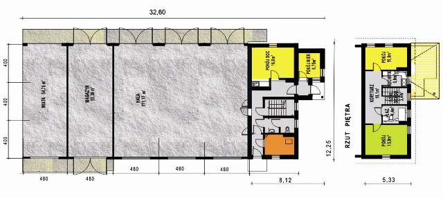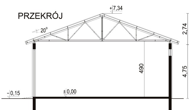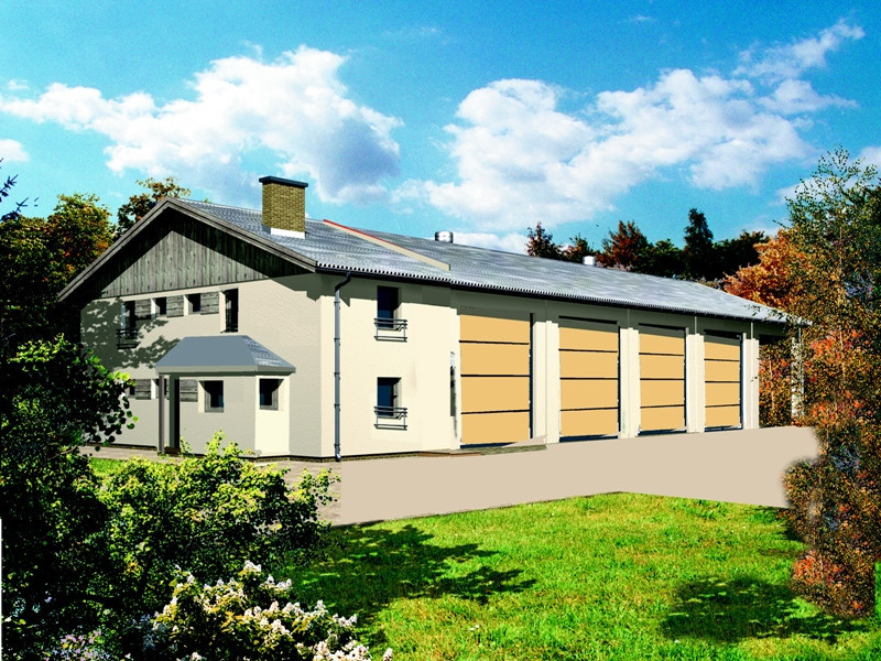 Budynek gospodarczy z halą, magazynem i wiatą. Zaprojektowano zaplecze i mieszkanie służbowe. obiekt wolnostojący, jednokondygnacyjny. Segment zaplecza i mieszkania służbowego jest budynkiem piętrowym. Budynek można skracać lub wydłużać zmieniając ilość segmentów. Długość segmentu budynku 4,8 m. Budynek można wykorzystać po adaptacji na serwis samochodowy, magazyn towarów nie wymagający ogrzewania. Może być również wykorzystany na warsztaty produkcyjne lub hangar na łodzie żagloweŚciany zewnętrzne: układ słupów żelbetowych w rozstawie 4,8 m, ściany gr. 24 cm z pustaków Alfa, ściany zaplecza gr. 39 cm z pustaków ceramicznych + styropian; strop: Istnieje możliwość wykonania stopu ocieplonego nad pomieszczeniem hali, podwieszonego do dolnego pasa wiązaru o ciężarze nieprzekraczjącym 0,5N/m2; dach: duspadowy o kacie nachylenia 20 stopni. Projekt dachowego wiązara kratowy W 101 w komplecie z projektem hali