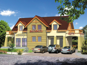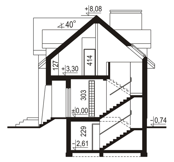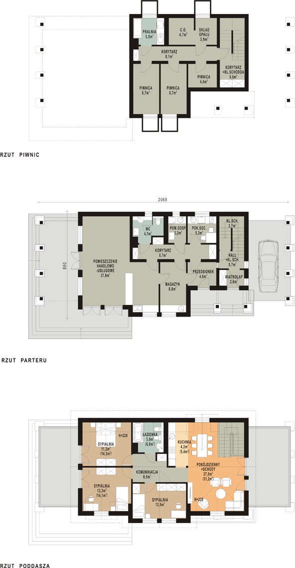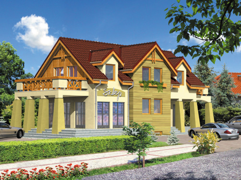 Budynek jednorodzinny parterowy z poddaszem mieszkalnym i sklepem, częściowo podpiwniczony, podcieńŚciany zewnętrzne: gr. 36,5 cm z bloczków YTONG; strop: żelbetowy; schody: żelbetowe; dach: dwuspadowy o kącie nachylenia 40 stopni, kryty blachą dachówkopodobną