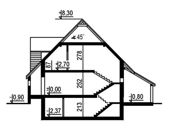 Budynek jednorodzinny parterowy z poddaszem mieszkalnym, częściowo podpiwniczonyŚciany zewnętrzne: gr. 38 cm z pustaków ceramicznych POROTHERM; strop: żelbetowy; schody: żelbetowe; dach: czterospadowy, o nachyleniu 45 stopni, więźba krokwiowo-płatwiowa, krycie dachówką
