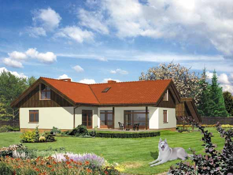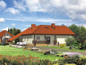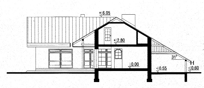 Budynek jednorodzinny, parterowy, z poddaszem mieszkalnym, częściowo podpiwniczonyŚciany zewnętrzne: gr. 43,0 cm, pustak ceramiczny POROTHERM + styropian; strop: żelbetowy; schody: żelbetowe; dach: dwuspadowy o nachyleniu 31 stopni, więźba drewniana, krycie dachówką