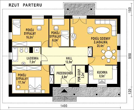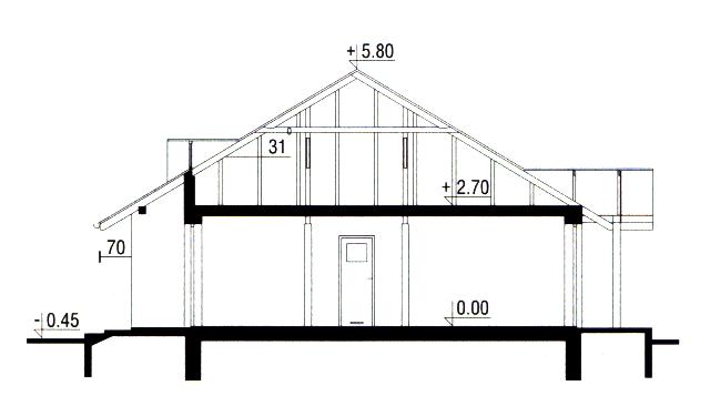 Budynek jednorodzinny, parterowy z poddaszem nieużytkowym, niepodpiwniczonyŚciany zewnętrzne: grubośc 40 cm bloczki gazobetonowe + styropian; strop: drewniany; dach: czterospadowy o nachyleniu 30 stopni, więźba krokwiowo-płatwiowo-jętkowa, krycie dachówką ceramiczną lub bitumiczną