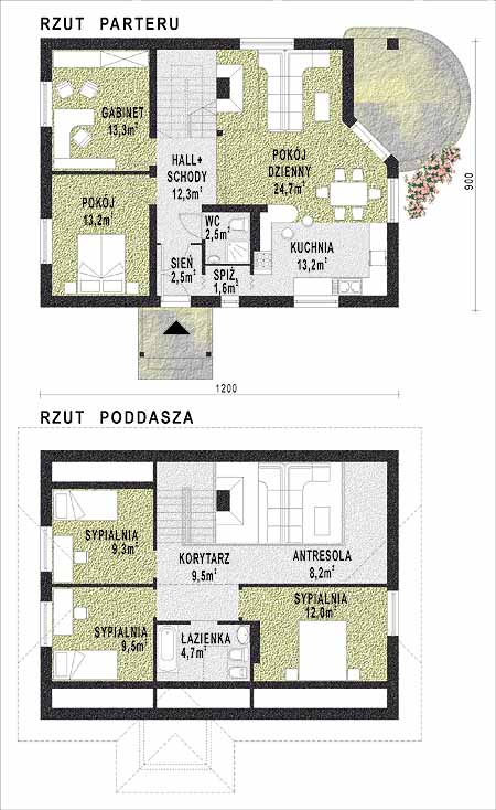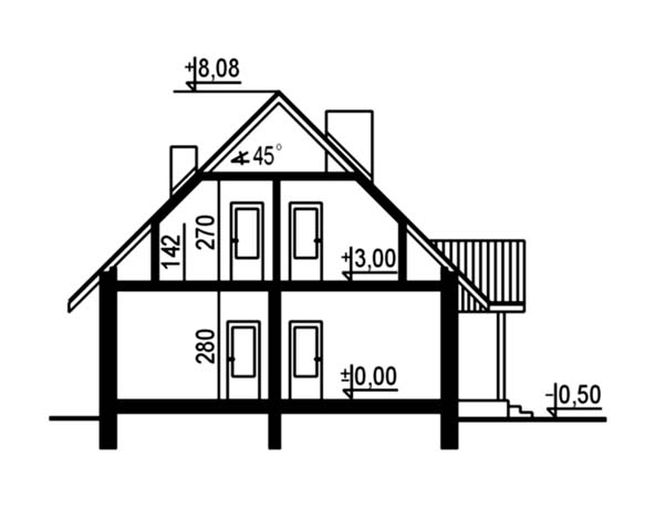 Budynek jednorodzinny, parterowy, z poddaszem mieszkalnym, niepodpiwniczonyŚciany zewnętrzne: grubość 38 cm pustak ceramiczny + styropian; strop: nad parterem płyta żelbetowa monolityczna; schody: drewniane, policzkowe, płyta spocznikowa żelbetowa; dach: dwuspadowy o nachyleniu 45 stopni, więźba drewniana, krokwiowo-jętkowa krycie dachówką ceramiczną