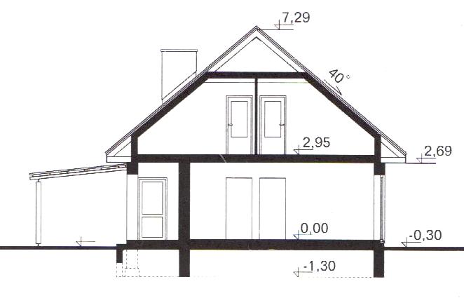 Budynek jednorodzinny, parterowy, z poddaszem mieszkalnym, niepodpiwniczony (I i II etap znajdują się w jednym projekcie)Ściany zewnętrzne: gr. 38,0 cm z pustaków POROTHERM; strop: drewniany, na podciągu z kształtownika walcowanego; schody: drewniane; dach: dwuspadowy o nachyleniu 40 stopni, więźba krokwiowo-jętkowa, krycie dachówką cementową lub ceramiczną