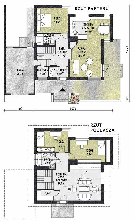 Budynek jednorodzinny, parterowy, z poddaszem mieszkalnym, częściowo podpiwniczony. Ściany zewnętrzne: grubość 40 cm: pustak MAX 19 cm + styropian 9 cm + cegła kratówka 12 cm; strop: FERT; schody: żelbetowe, 3-biegowe; dach: dwuspadowy o nachyleniu 40 stopni, więźba drewniana, krycie dachówką bitumiczną lub blachodachówką