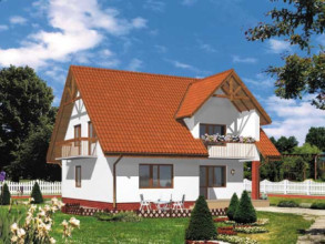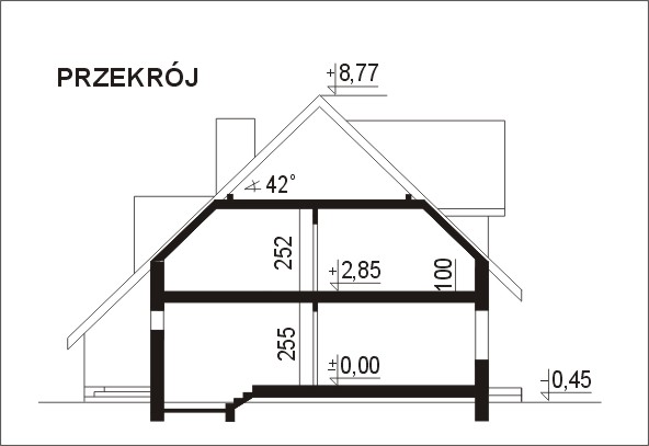 Budynek jednorodzinny, parterowy, z poddaszem mieszkalnym, niepodpiwniczonyŚciany zewnętrzne: grubość 38,0 cm z pustaków POROTHERM; strop: FERT; schody: żelbetowe; dach: dwuspadowy o nachyleniu 42 stopni, więźba krokwiowo-płatwiowa, krycie dachówką ceramiczną