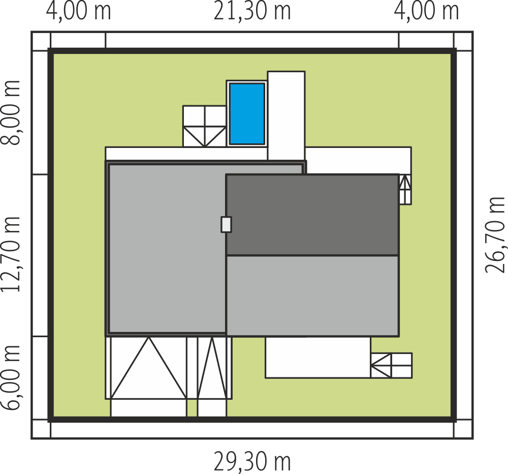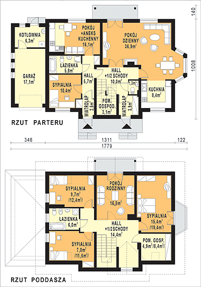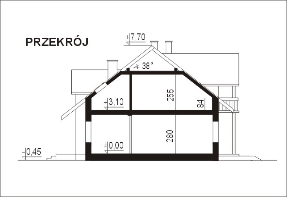 Budynek jednorodzinny, trzypokoleniowy, parterowy z poddaszem mieszkalnym, niepodpiwniczonyŚciany zewnętrzne: gr. 38 cm z pustaków ceramicznych POROTHERM; strop: FERT; schody: żelbetowe; dach: dwuspadowy o nachyleniu 38 stopni, więźba krokwiowo-jętkowa, krycie dachówką
