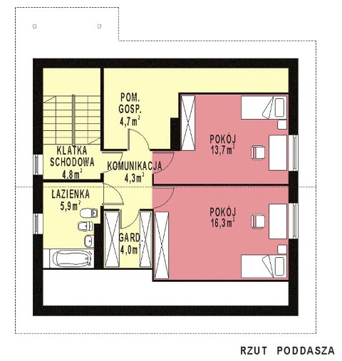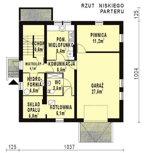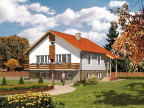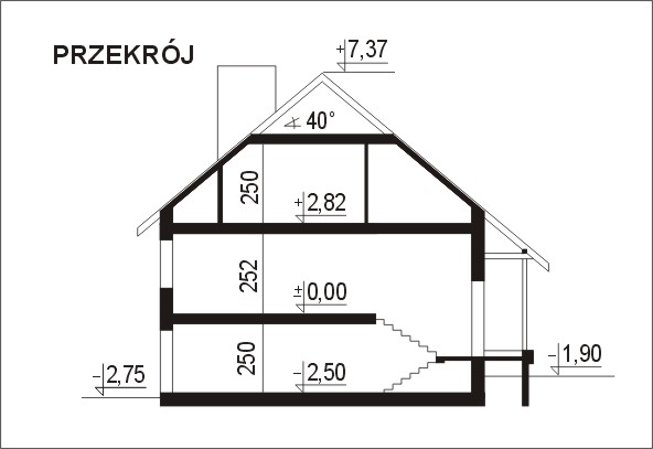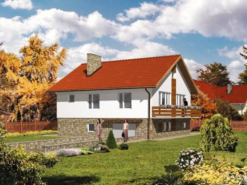 Budynek jednorodzinny z niskim i wysokim parterem z poddaszem użytkowym lub nieużytkowym (w projekcie 2 warianty), niepodpiwniczonyŚciany zewnętrzne: gr. 38 cm - z pustaków ceramicznych + styropian; strop: FERT i żelbetowy; schody: żelbetowe; dach: dwuspadowy o nachyleniu 30 stopni dla wersji z poddaszem nieużytkowym lub 40 stopni dla wersji z poddaszem uzytkowym, Więźba krokwiowo-kleszczowa, krycie dachówką