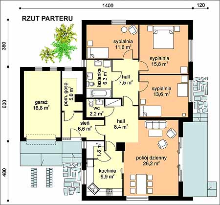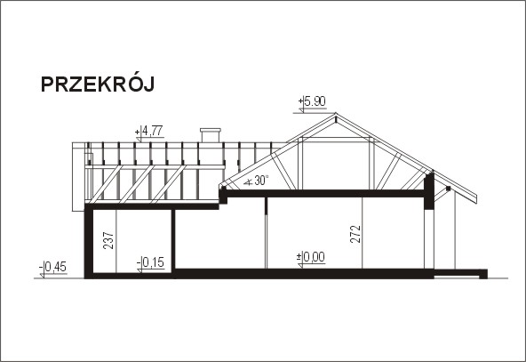 Budynek jednorodzinny, parterowy, z poddaszem nieużytkowym, niepodpiwniczonyŚciany zewnętrzne: grubość 36,5 m: Bloczek YtongEnergoUltra+PP2,2/,03; strop: drewniany; schody: żelbetowe; dach: dwuspadowy o nachyleniu 30 stopni, więźba drewniana, krycie dachówką ceramiczną