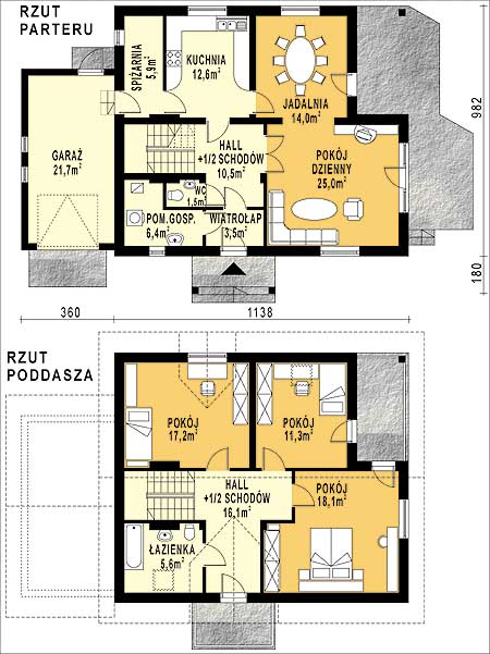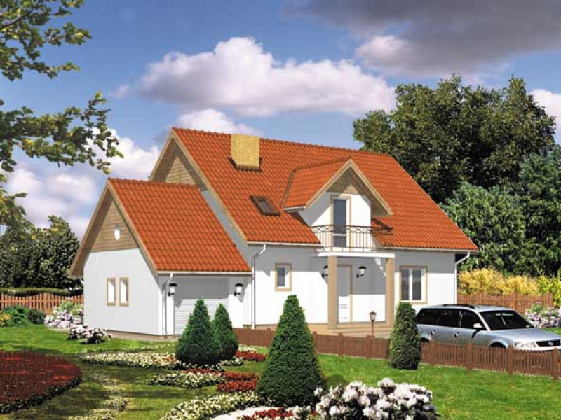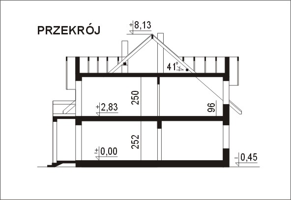 Budynek jednorodzinny, parterowy, z poddaszem mieszkalnym, niepodpiwniczony, z garażemŚciany zewnętrzne: grubość 38,0 cm z pustaków POROTHERM; strop: TERRIVA, nad garażem żelbetowy; schody: żelbetowe; dach: dwuspadowy o nachyleniu 41 stopni, więźba krokwiowo-jętkowa, krycie dachówką ceramiczną