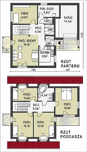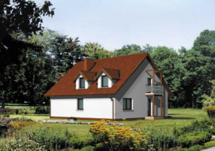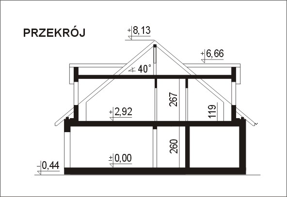 Budynek jednorodzinny, parterowy, z poddaszem mieszkalnym, niepodpiwniczonyŚciany zewnętrzne: grubość 36,5 cm: z bloczków YTONG; strop: TERIVA 1; schody: żelbetowe, płytowe, dwubiegunowe; dach: dwuspadowy o nachyleniu 40 stopni, więźba drewniana krokwiowo-jętkowa z płatwią kalenicową, krycie dachówką