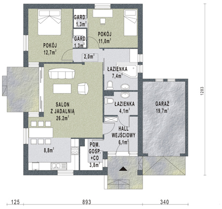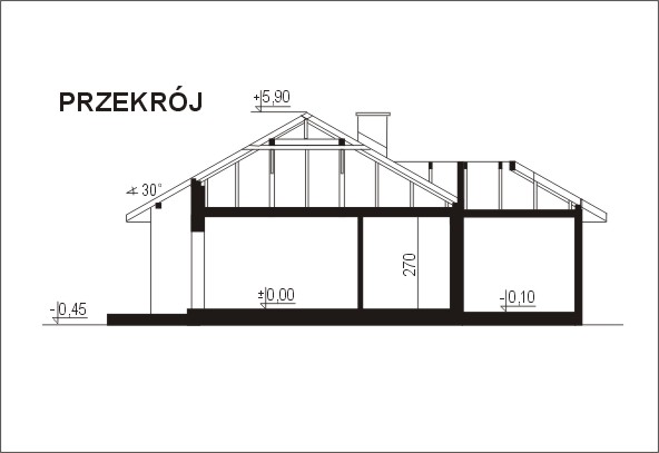 Budynek jednorodzinny, parterowy, z poddaszem nieużytkowym, niepodpiwniczonyŚciany zewnętrzne: grubość 36,5 cm z bloczków YTONG, w garażu grubość 20 cm z bloczków YTONG; strop: drewniany belkowy oparty na ścianach zewnętrznych i podciągach żelbetowych; dach: czterospadowy o nachyleniu 30 stopni, więźba drewniana płatwiowo-jętkowa, krycie dachówką cementową firmy BRAAS lub dachówką ceramiczną