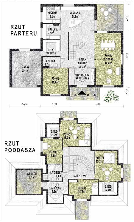 Budynek jednorodzinny, parterowy, z poddaszem mieszkalnym, niepodpiwniczonyŚciany zewnętrzne: grubość 36,5 cm z bloczków YTONG; strop: belkowy prefabrykowany TERIVA1 nad poddaszem drewniany na jętkach; schody: o konstrukcji stalowej i stopniach drewnianych; dach: czterospadowy o nachyleniu 40 stopni więźba drewniana, krokwiowo-płatwiowa krycie dachówką cementową BRAAS