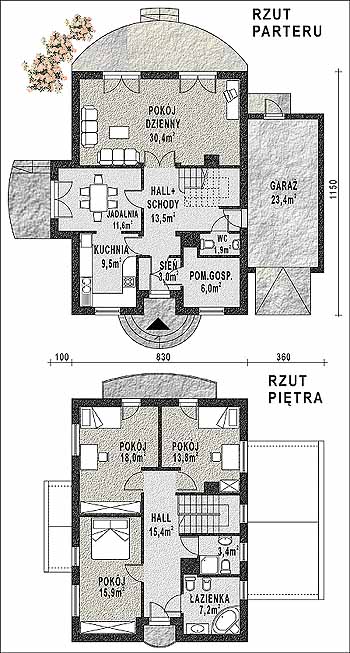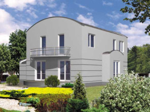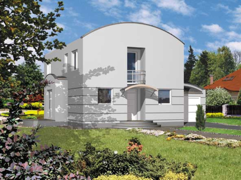 Budynek jednorodzinny, piętrowy, niepodpiwniczonyŚciany zewnętrzne: grubość 36,5 cm z bloczków Termalica KLASA 350; strop: międzypiętrowy - płyta żelbetowa; schody: żelbetowe; dach: w kształcie łukowym, więźba drewniana - wiązary deskowe, krycie blachą płaską, nachylenie 21 stopni
