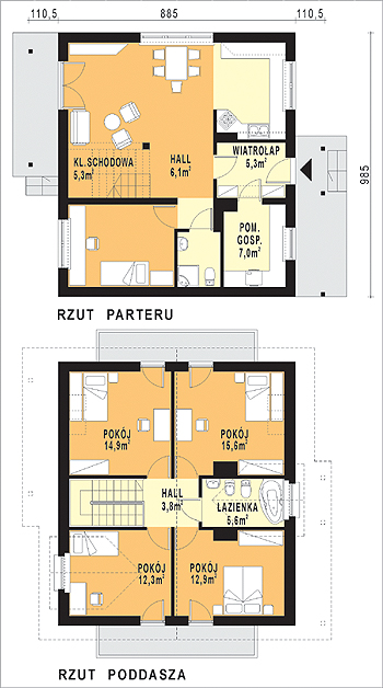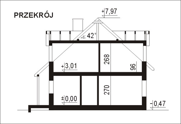 Budynek jednorodzinny, parterowy z poddaszem mieszkalnym, niepodpiwniczonyŚciany zewnętrzne: gr. 36,5 cm z bloczków YTONG; strop: TERIVA; schody: żelbetowe; dach: dwuspadowy o nachyleniu 42 stopni, więźba krokwiowo-jętkowa, krycie dachówką