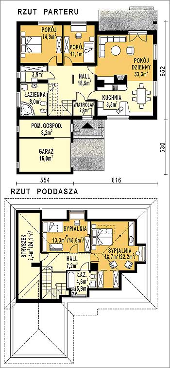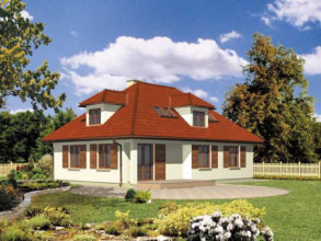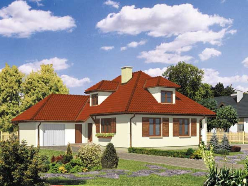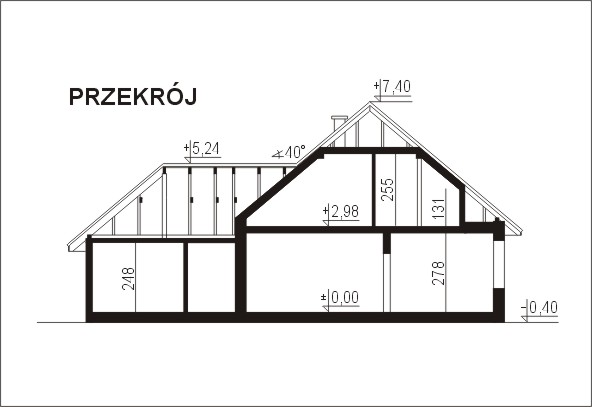 Budynek jednorodzinny parterowy z poddaszem mieszkalnym, niepodpiwniczonyŚciany zewnętrzne: gr. 38,0 cm z pustaków ceramicznych POROTHERM; strop: żelbetowy; schody: żelbetowe; dach: czterospadowy o nachyleniu 40 stopni, więźba krokwiowo-płatwiowa, krycie blachodachówką