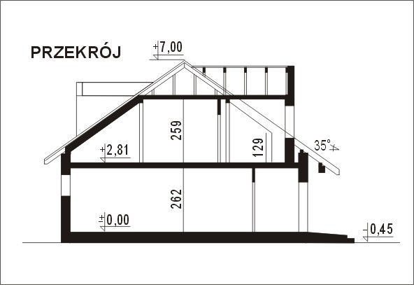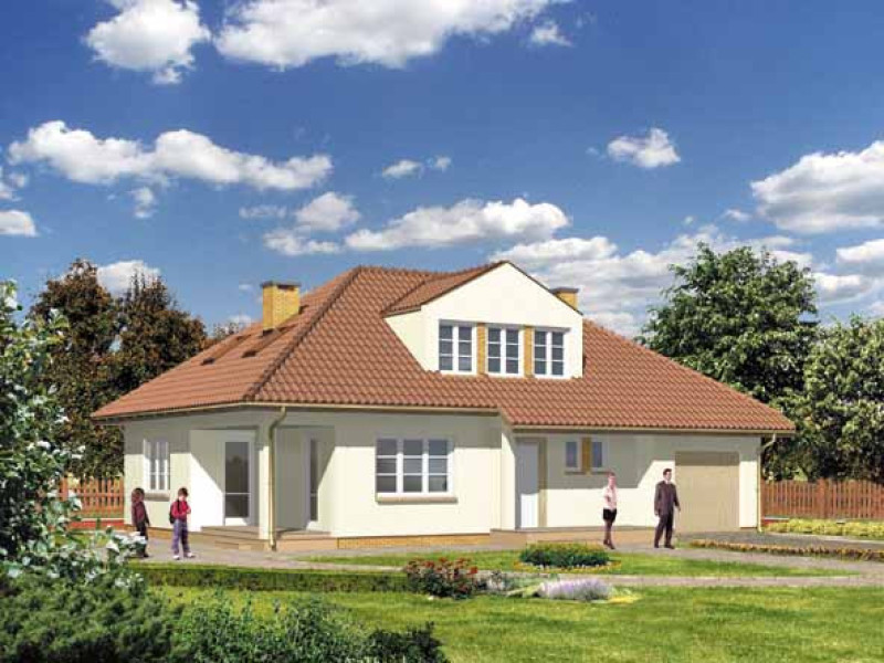 Budynek jednorodzinny, parterowy, z poddaszem mieszkalnym, niepodpiwniczonyŚciany zewnętrzne: gr. 36,5 cm z bloczków YTONG; strop: żelbetowy; schody: żelbetowe; dach: czterospadowy o nachyleniu 35 stopni, krycie blachodachówką