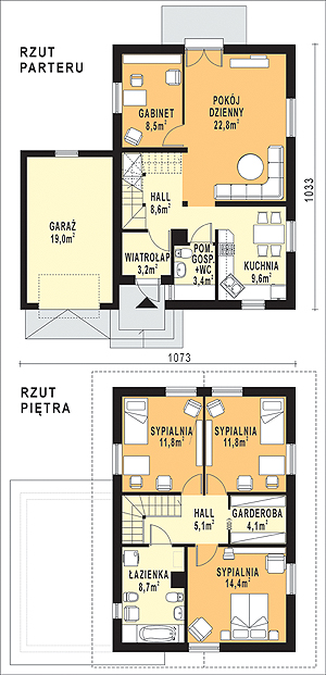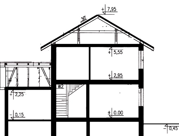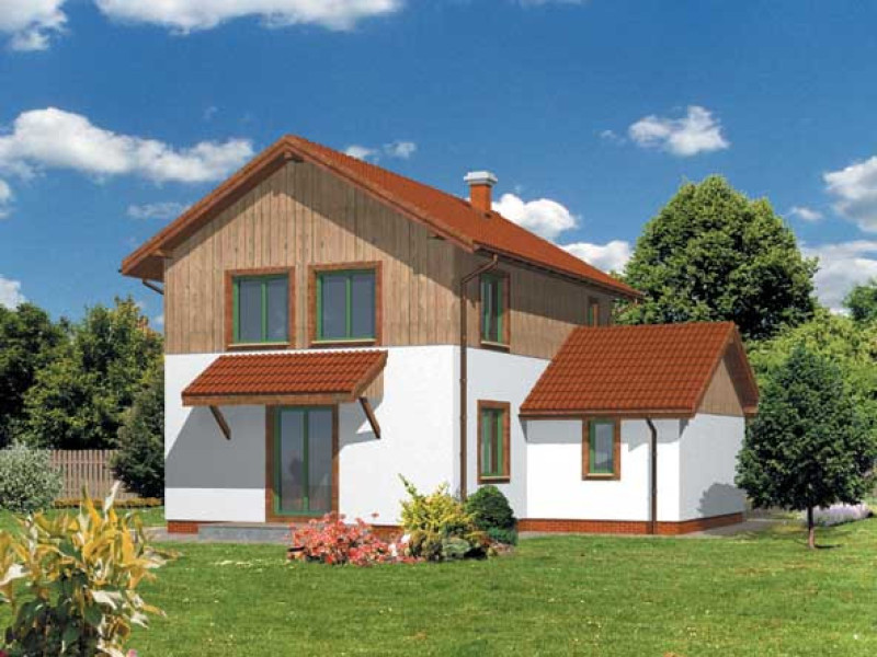 Budynek jednorodzinny, piętrowy, niepodpiwniczonyŚciany zewnętrzne: gr. 36,5 cm z bloczków YTONG; strop: FERT; schody: drewniane; dach: dwuspadowy o nachyleniu 30 stopni, więźba krokwiowo-jętkowa, krycie dachówką