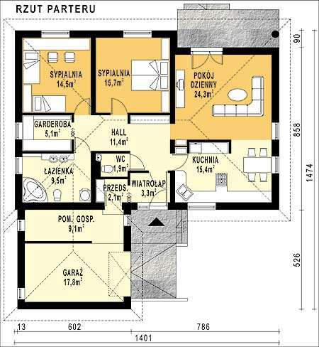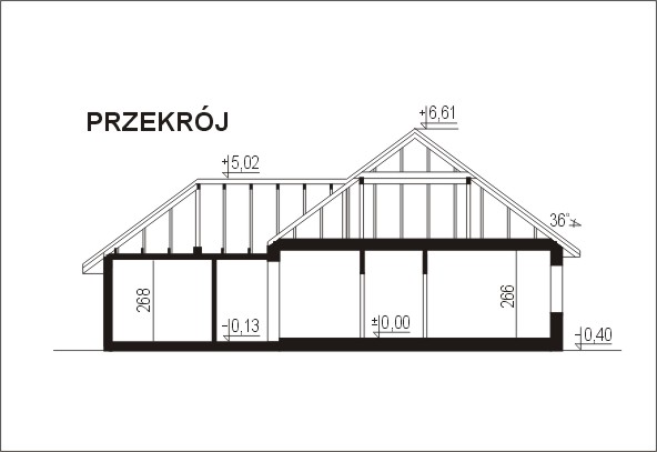 Budynek jednorodzinny, parterowy, niepodpiwniczony z poddaszem nieużytkowymŚciany zewnętrzne: grubość 38,0 z pustaków POROTHERM; strop: TERIVA; schody: drewniane; dach: czterospadowy o nachyleniu 36 stopni, więźba krokwiowo-płatwiowa, krycie dachówką ceramiczną