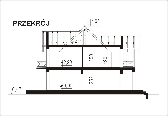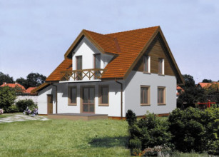 Budynek jednorodzinny, parterowy, z poddaszem mieszkalnym, niepodpiwniczonyŚciany zewnętrzne: grubość 36,5 cm - bloczki YTONG; strop: belkowy, prefabrykowany typu TERIVA 1; schody: żelbetowe; dach: dwuspadowy z lukarnami o nachyleniu 41 stopni, więźba drewniana krokwiowo-jętkowa, krycie dachówką cementową firmy BRAAS