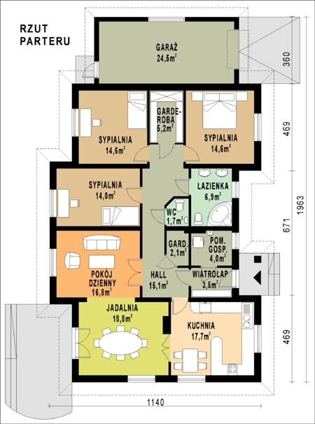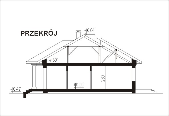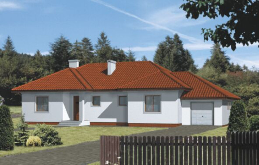 Budynek jednorodzinny, parterowy, z poddaszem nieużytkowym, niepodpiwniczonyŚciany zewnętrzne: grubość 36,5 cm z bloczków YTONG; strop: żelbetowy; dach: czterospadowy o nachyleniu 30 stopni, więźba krokwiowo-płatwiowa ze słupkami, krycie dachówką cementową BRAAS