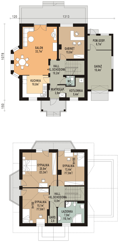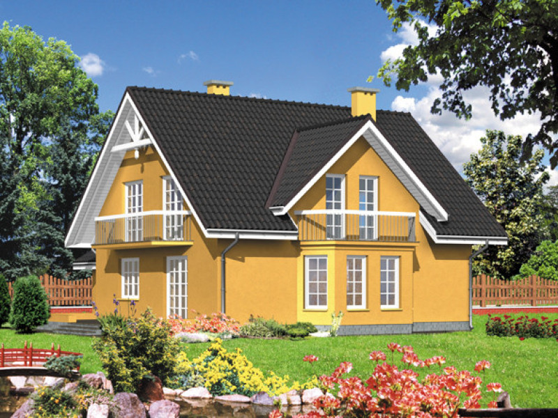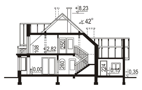 Budynek jednorodzinny parterowy z poddaszem mieszkalnym, niepodpiwniczonyŚciany zewnętrzne: gr. 44 cm z pustaków ceramicznych POROTHERM; strop: żelbetowy; schody: żelbetowe; dach: dwuspadowy o nachyleniu 42 stopni, krycie dachówką ceramiczną KORAMIC