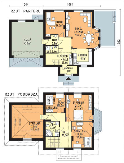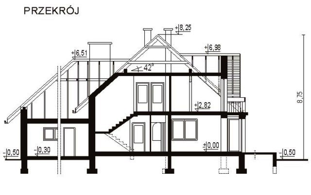 Budynek jednorodzinny parterowy z poddaszem mieszkalnym, niepodpiwniczonyŚciany zewnętrzne: gr. 44 cm z pustaków ceramicznych POROTHERM; strop: żelbetowy; schody: żelbetowe; dach: dwuspadowy z naczółkami, nad garażem trójspadowy o nachyleniu 42 stopni, więźba krokwiowo-płatwiowo-kleszczowa, krycie dachówką