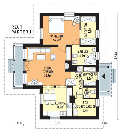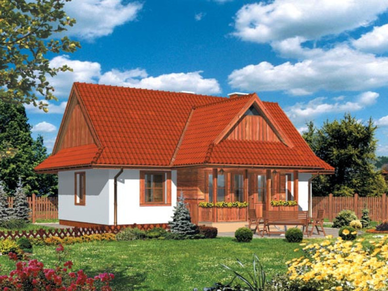 Budynek jednorodzinny parterowy z poddaszem nieużytkowym, niepodpiwniczonyŚciany zewnętrzne: gr. 36 cm z bloczków wapienno-piaskowych SILKA 24 cm + styropian 12 cm; strop: żelbetowy; dach: dwuspadowy o nachyleniu 45 stopni, więźba krokwiowo-jętkowa, krycie dachówką