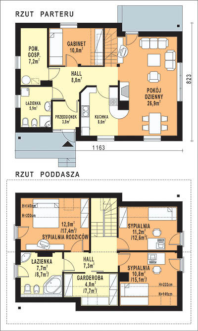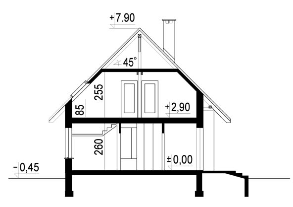 Budynek jednorodzinny parterowy z poddaszem mieszkalnym, niepodpiwniczonyŚciany zewnętrzne: gr. 36,5 cm z bloczków YTONG; strop: TERIVA; schody: drewniane; dach: dwuspadowy, o nachyleniu 45 stopni, więźba krokwiowo-jętkowa z płatwią kalenicową, krycie dachówką