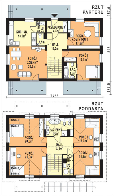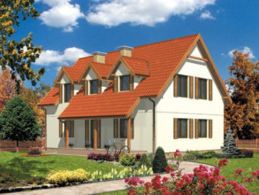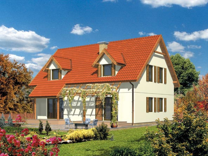 Budynek jednorodzinny parterowy z poddaszem mieszkalnym, niepodpiwniczonyŚciany zewnętrzne: gr. 41 cm z pustaków ceramicznych MAX 29 cm + styropian 12 cm; strop: FERT; schody: drewniane; dach: dwuspadowy o nachyleniu 45 stopni, więźba krokwiowo-jętkowa, krycie dachówką