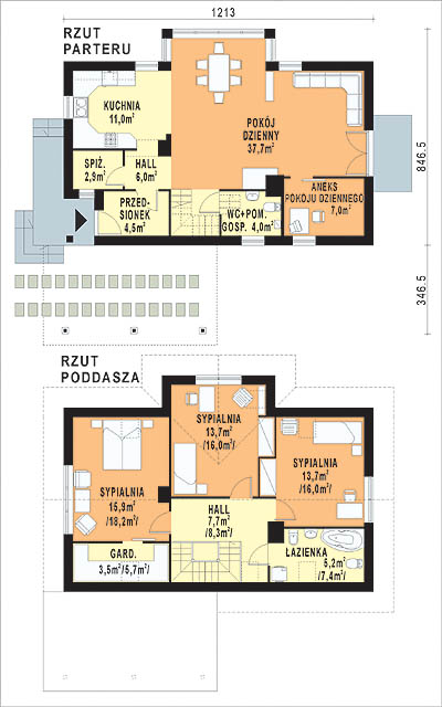 Budynek jednorodzinny parterowy z poddaszem mieszkalnym, niepodpiwniczony Ściany zewnętrzne: grubość 36,5cm z bloczków YTONG; strop: FERT; dach: dwuspadowy o nachyleniu 45° i 30° (nad wiatą)
