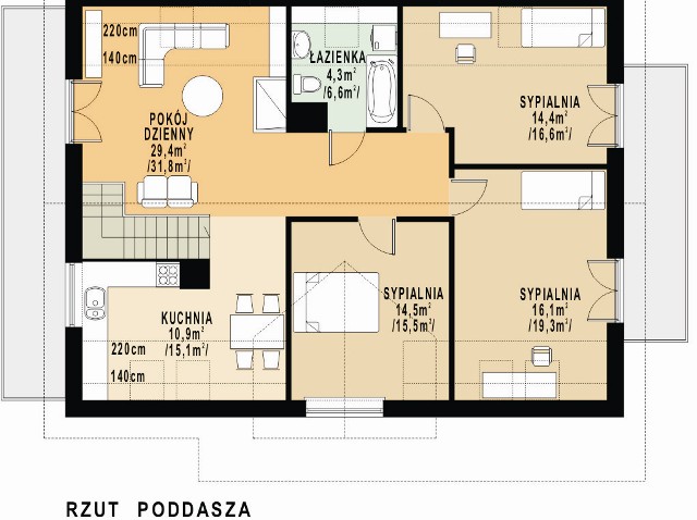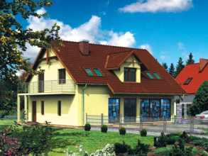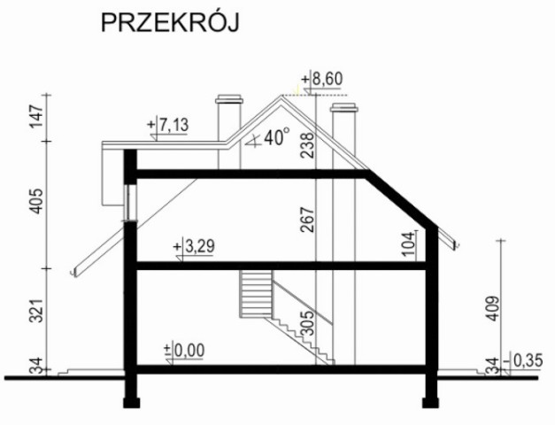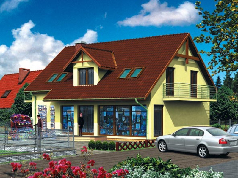 Budynek mieszkalny z funkcją usługową, parterowy z poddaszem, niepodpiwniczonyŚciany zewnętrzne: gr. 39 cm, pustak porotherm 30cm + styropian 9cm; strop: żelbetowy; schody: żelbetowe; dach: dwuspadowy, o nachyleniu 40 stopni, więźba krokwiowo-kleszczowa, krycie dachówką