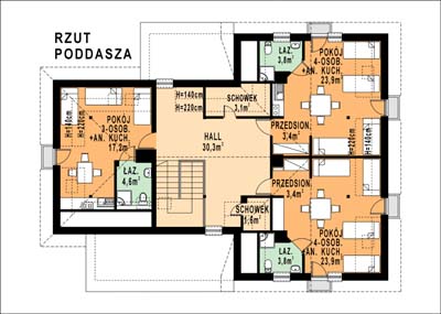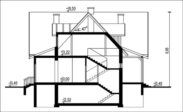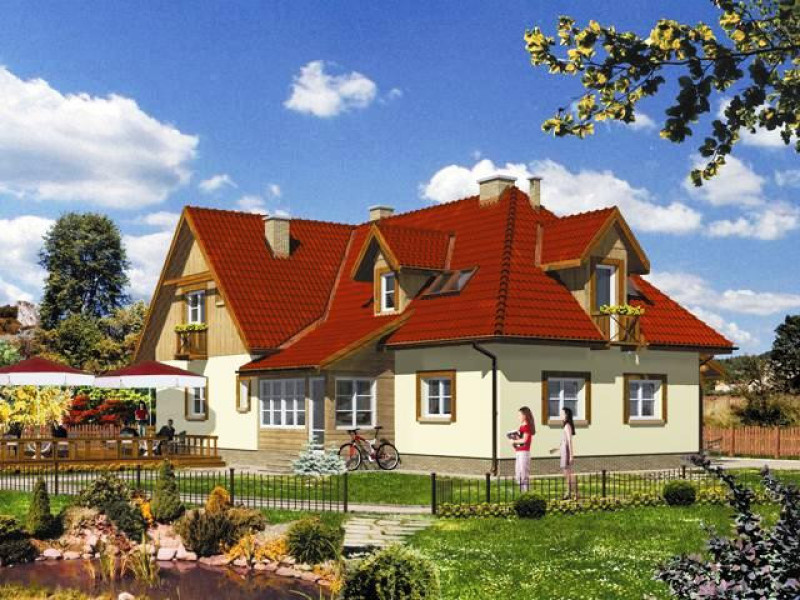 PENSJONAT DLA 19 OSÓB, parterowy z poddaszem mieszkalnym, częściowo podpiwniczonyŚciany zewnętrzne: gr. 44 cm z pustaków ceramicznych POROTHERM; strop: żelbetowy; schody: żelbetowe; dach: dwu i trzyspadowy o nachyleniu 47 stopni, więźba krokwiowo-płatwiowo-jętkowa, krycie dachówką