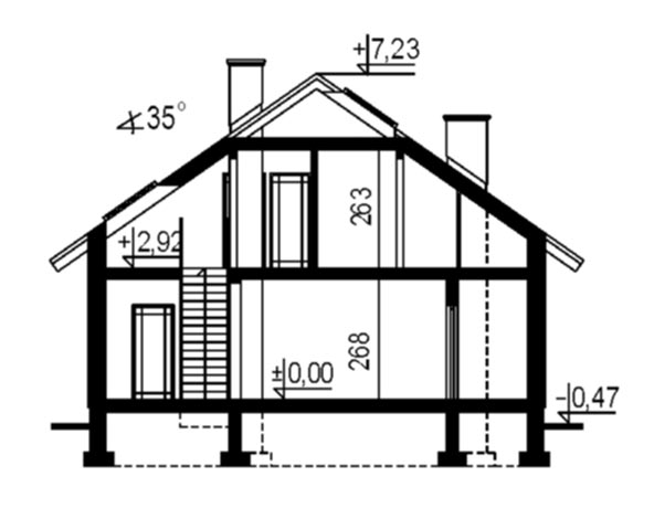 Budynek jednorodzinny parterowy z poddaszem mieszkalnym, niepodpiwniczonyŚciany zewnętrzne: gr. 38 cm z pustaków ceramicznych POROTHERM; strop: żelbetowy; schody: drewniane; dach: czterospadowy, o nachyleniu 35 stopni
