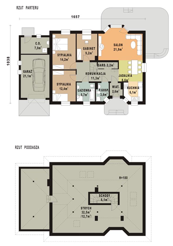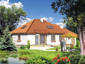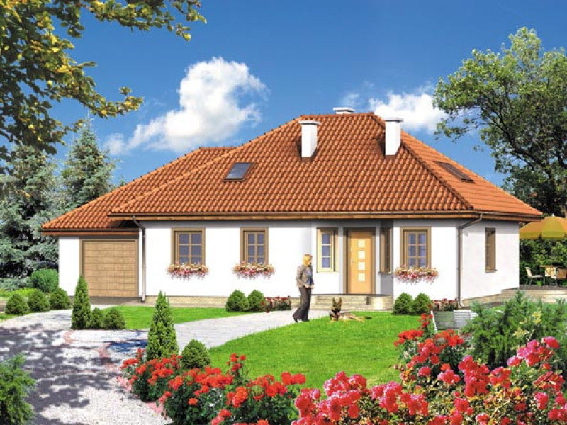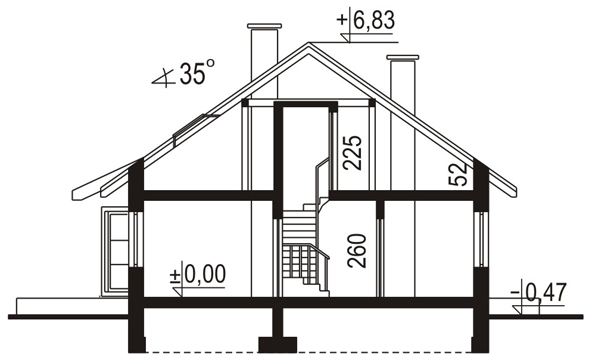 Budynek jednorodzinny parterowy z poddaszem nieużytkowym, niepodpiwniczonyŚciany zewnętrzne: gr. 39 cm z pustaków ceramicznych + wełna ROCKWOOL; strop: żelbetowy; schody: drewniane; dach: czterospadowy o nachyleniu 35 stopni, krycie dachówką