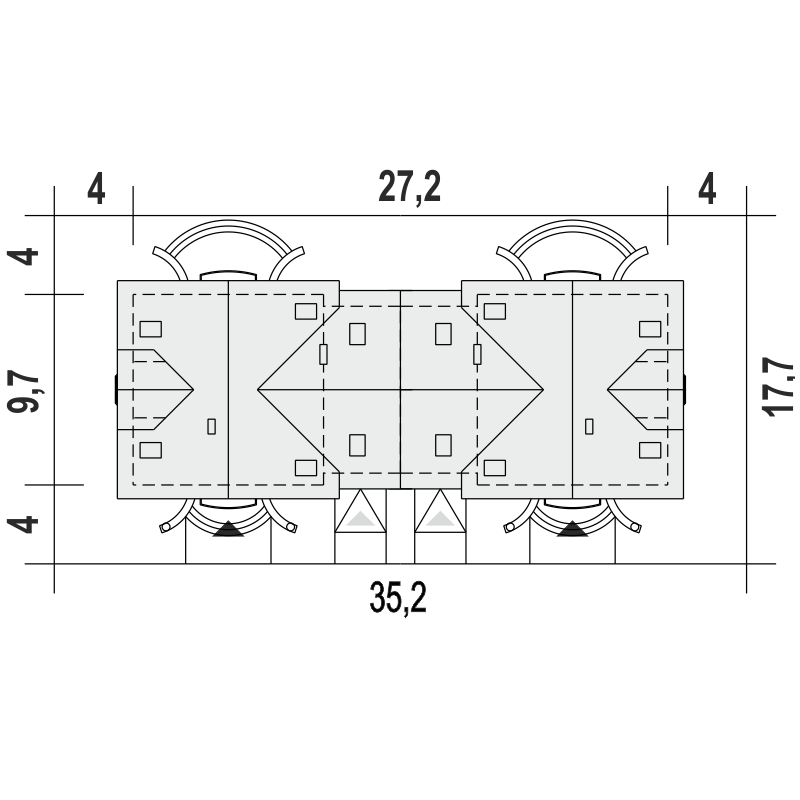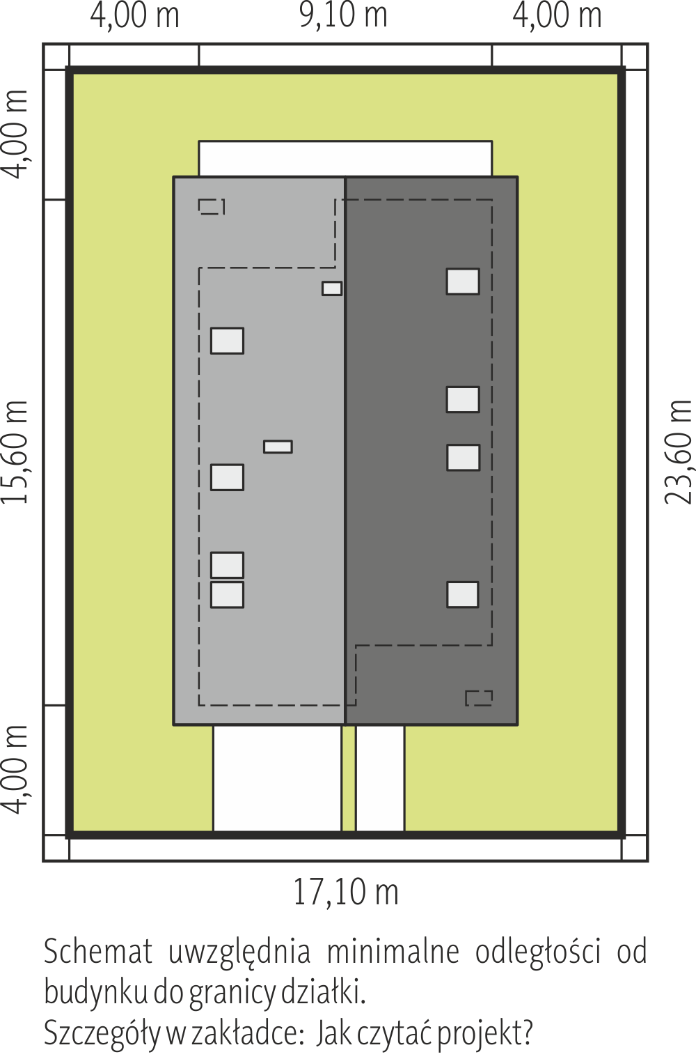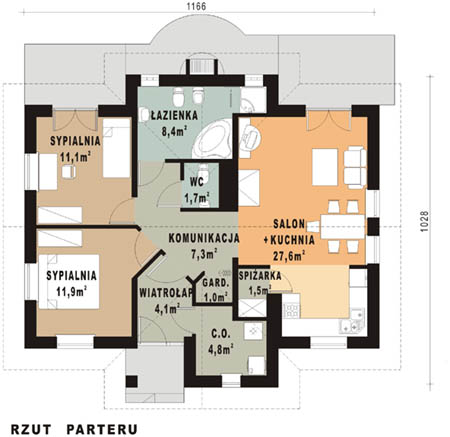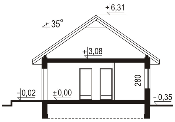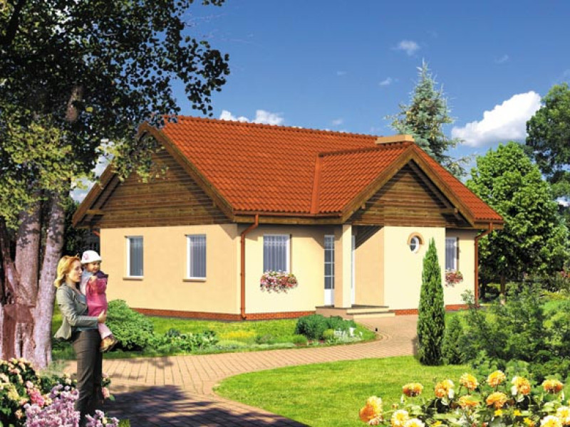 Budynek jednorodzinny parterowy z poddaszem nieużytkowym, niepodpiwniczonyŚciany zewnętrzne: gr. 39 cm z pustaków ceramicznych + styropian; strop: żelbetowy; dach: dwuspadowy o nachyleniu 35 stopni, krycie dachówką