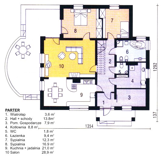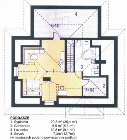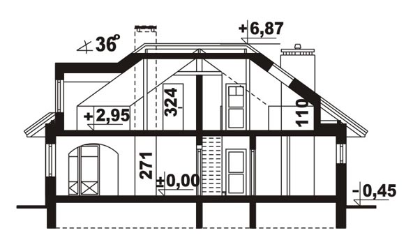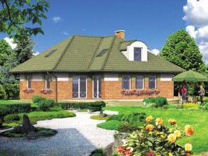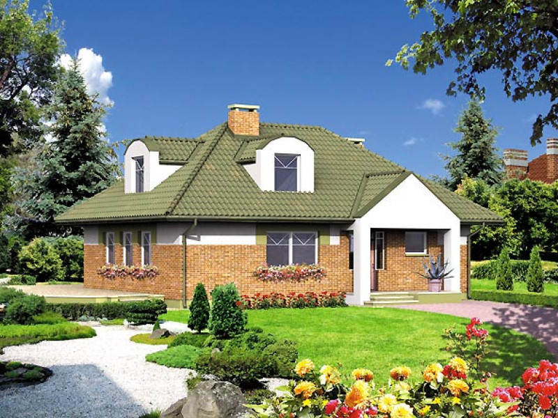 Budynek jednorodzinny parterowy z poddaszem mieszkalnym, niepodpiwniczonyŚciany zewnętrzne: gr. 44 cm z pustaków ceramicznych MAX + styropian + płytki elewacyjne TERCA; strop: żelbetowy; schody: drewniane; dach: czterospadowy o nachyleniu 36 stopni, krycie dachówką