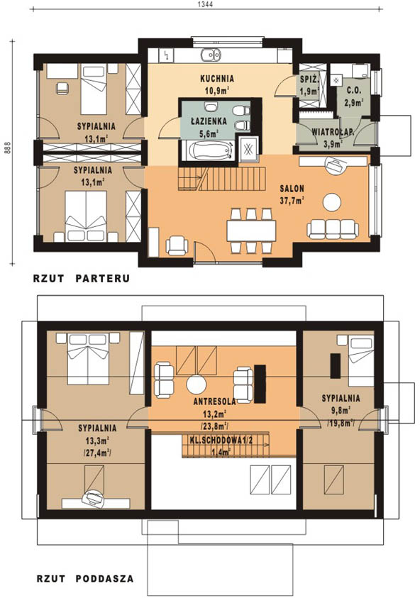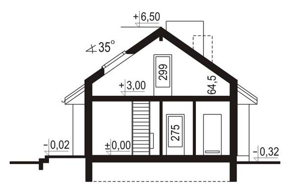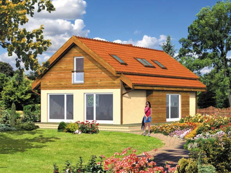 Budynek jednorodzinny parterowy z poddaszem mieszkalnym, niepodpiwniczonyŚciany zewnętrzne: gr. 36 cm z betonu komórkowego + wełna mineralna ROCKWOOL; strop: żelbetowy; schody: drewniane; dach: dwuspadowy o nachyleniu 35 stopni, krycie blachodachówką