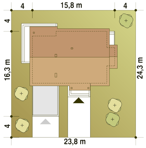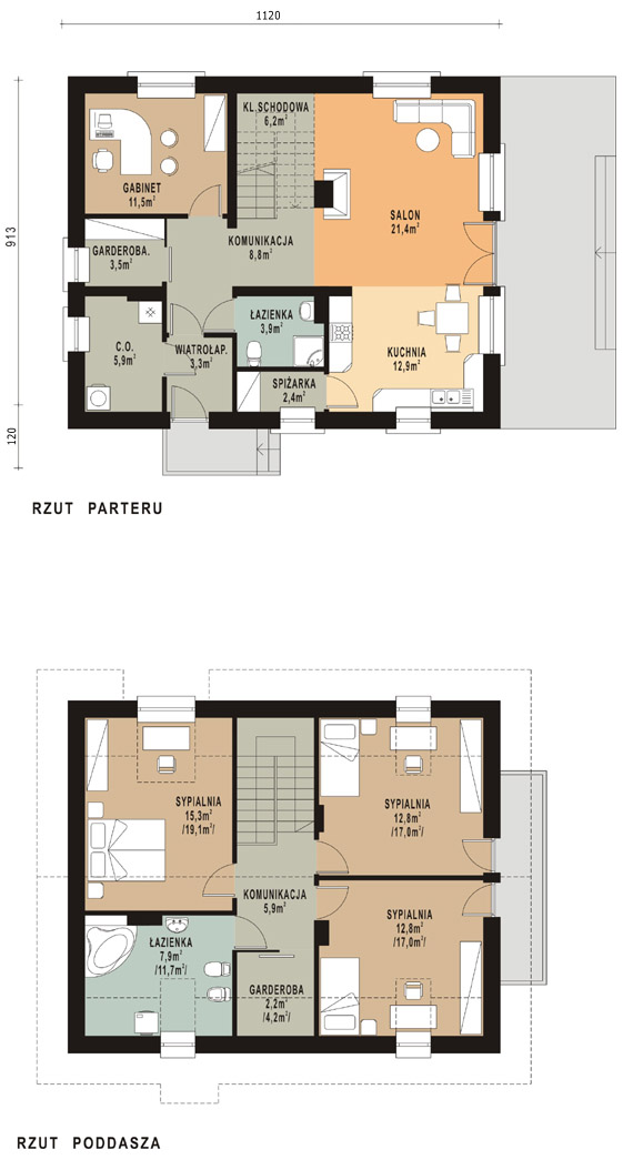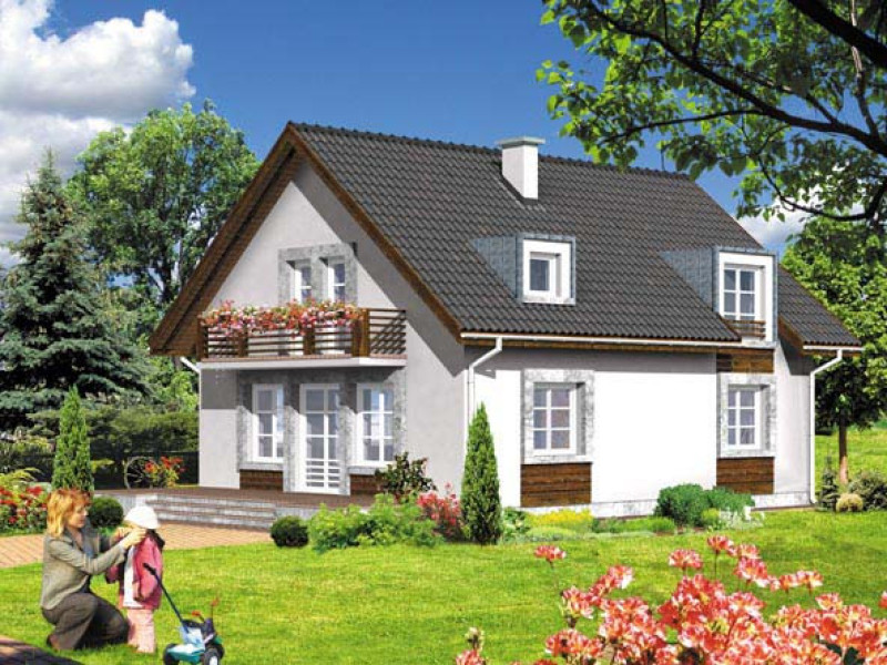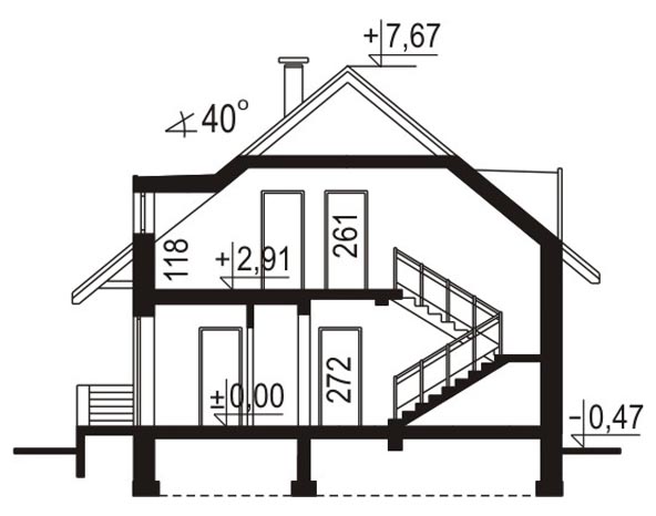 Budynek jednorodzinny parterowy z poddaszem mieszkalnym, niepodpiwniczonyŚciany zewnętrzne: gr. 44 cm z pustaków ceramicznych POROTHERM; strop: POROTHERM; schody: żelbetowe; dach: dwuspadowy o nachyleniu 40 stopni, krycie dachówką