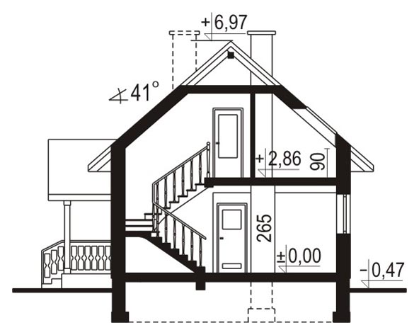 Budynek jednorodzinny parterowy z poddaszem mieszkalnym, niepodpiwniczonyŚciany zewnętrzne: gr. 41 cm z pustaków ceramicznych MAX 29 cm + wełna ROCKWOOL 12 cm; strop: żelbetowy; schody: drewniane; dach: dwuspadowy o nachyleniu 41 stopni, krycie dachówką