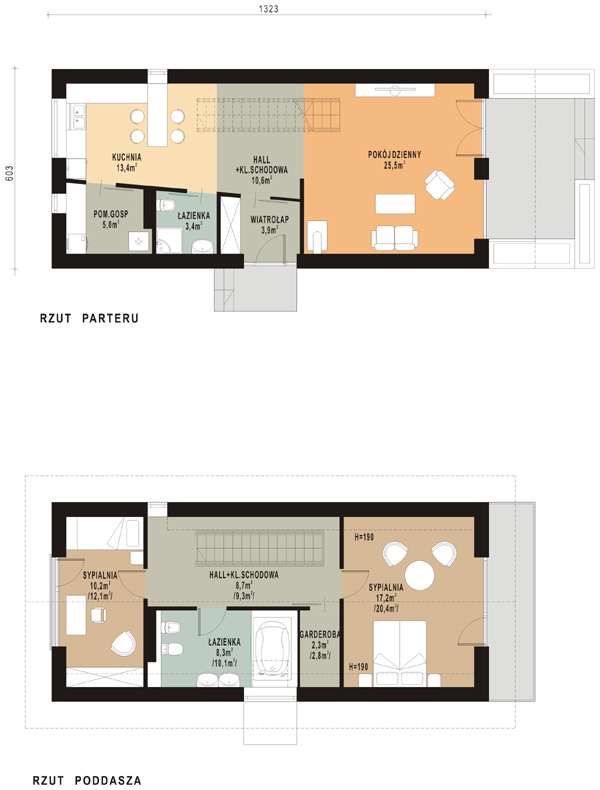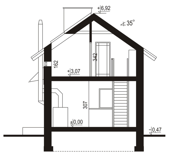 Budynek jednorodzinny parterowy z poddaszem mieszkalnym, niepodpiwniczonyŚciany zewnętrzne: gr. 44 cm z pustaków ceramicznych POROTHERM; strop: żelbetowy; schody: drewniane; dach: dwuspadowy o nachyleniu 35 stopni, kryty dachówką ceramiczną KORAMIC