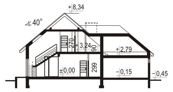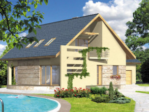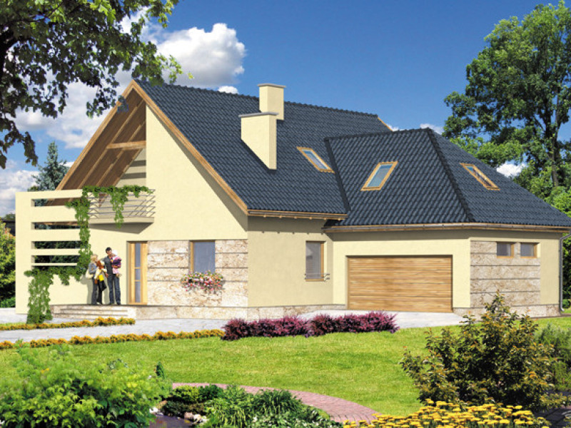 Budynek jednorodzinny parterowy z poddaszem mieszkalnym, niepodpiwniczonyŚciany zewnętrzne: gr. 36,5 cm z bloczków YTONG; strop: żelbetowy; schody: drewniane; dach: dwuspadowy o nachyleniu 40 stopni, kryty dachówką