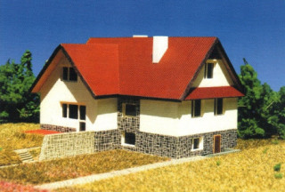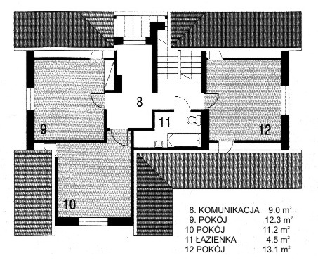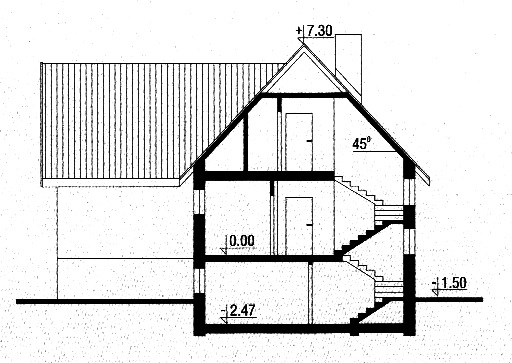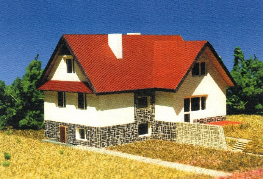 Budynek jednorodzinny parterowy z poddaszem mieszkalnym, częściowo podpiwniczony. 6 pokoi z kuchnią. W poziomie piwnic pomieszczenia gospodarcze z oddzielnym wejściem, kotłownia i skład opału. Ściany zewnętrzne: gr. 38 cm z pustaków ceramicznych + styropian; strop: płyta żelbetowa monolityczna, nad parterem DZ-3 lub Fert 40, nad poddaszem drewniany; schody: żelbetowe; dach: dwuspadowy o kacie nachylenia 45 stopni, kryty dachówką ceramiczną lub blachą dachówkową