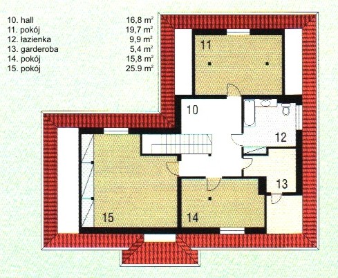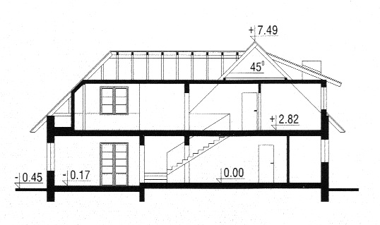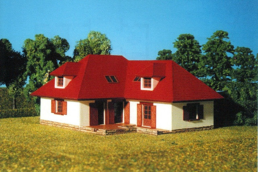 Budynek jednorodzinny parterowy z poddaszem mieszkalnym, niepodpiwniczony. 6 pokoi z kuchnią,Ściany zewnętrzne: gr. 38 cm z pustaków ceramicznych + styropian; strop: stropie Fert 45 alternatywnie płyta żelbetowa monolityczna, nad poddaszem drewniany; schody: drewniane; dach: dach czterospadowy a kącie nachylenia 45 stopni, kryty dachówką lub blachą dachówkową