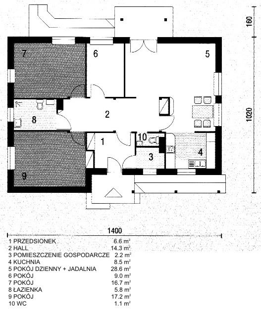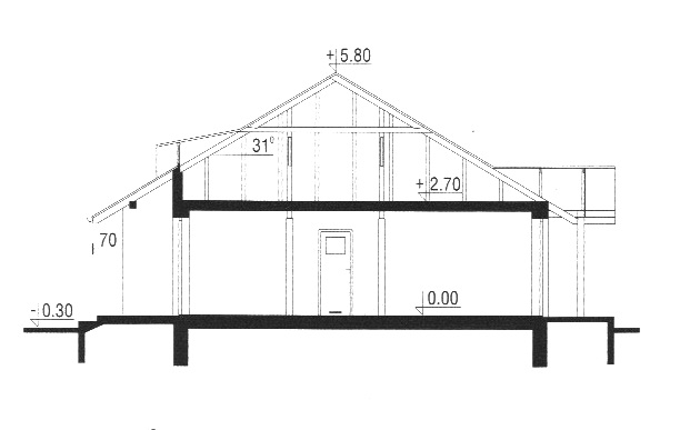 Budynek mieszkalny dla rodziny z osobą niepełnosprawną parterowy niepodpiwniczonyŚciany zewnętrzne: gr. 38 cm z pustaków ceramicznych + styropian; strop: drewniany; dach: czterospadowy o kacie nachylenia 31 stopni, kryty dachówką ceramiczną lub blachą dachówkową
