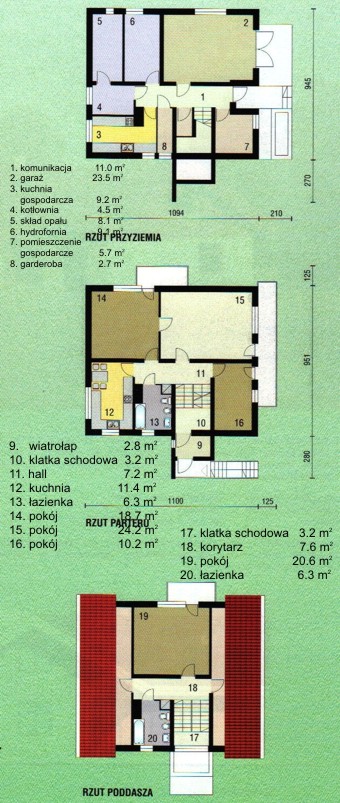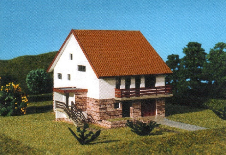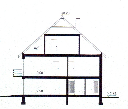 Budynek jednorodzinny parterowy z poddaszem mieszkalnym. Program - 4 pokoje z kuchnią. W przyziemiu garaż i pomieszczenia techniczno-gospodarcze z oddzielnym wejściem. Ściany zewnętrzne: gr. 38 cm z pustaków ceramicznych + styropian; strop: Fert 40 alt. DZ-3 lub płyta monolityczna żelbetowa, nad poddaszem drewniany; schody: żelbetowe; dach: dwuspadowy o kacie nachylenia 42 stopnie, kryty blachą profilowaną lub dachówką ceramiczną