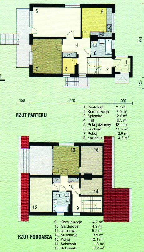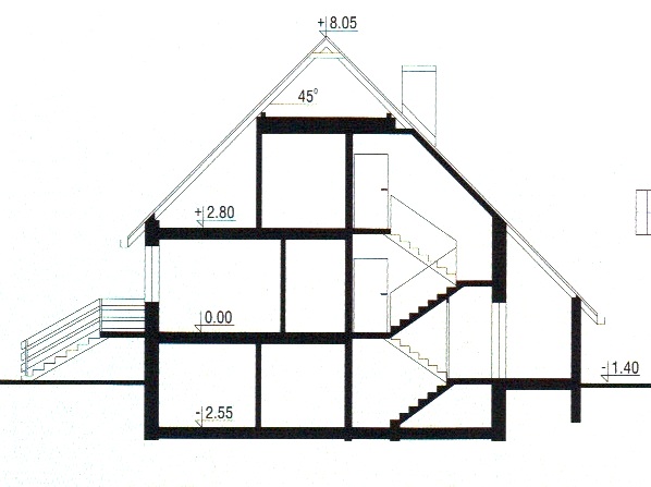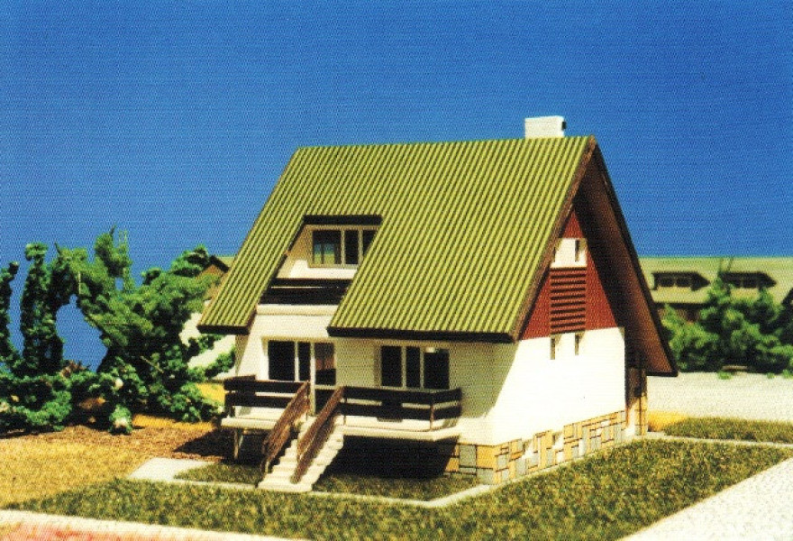Budynek jednorodzinny parterowy z poddaszem mieszkalnym, całkowicie podpiwniczony. 3 pokoje z kuchnią. W poziomie piwnic garaż, kotłownia i skład opału oraz pomieszczenia gospodarczo-techniczne {oddzielne wejście)Ściany zewnętrzne: gr. 38 cm z pustaków ceramicznych + styropian; strop: Fert 45 alternatywnie OZ-3 lub płyta żelbetowa monolityczna; schody: żelbetowe; dach: dwuspadowy o kacie nachylenia 45 stopni, kryty dachówką ceramiczną lub blachą profilowaną